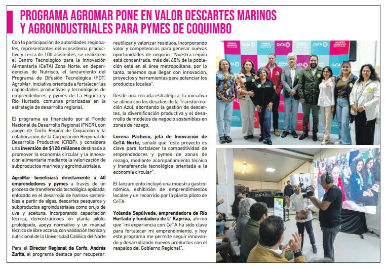 CeTA en Diario El Día: Programa AgroMar pone en valor descartes marinos y agroindustriales para pymes de Coquimbo